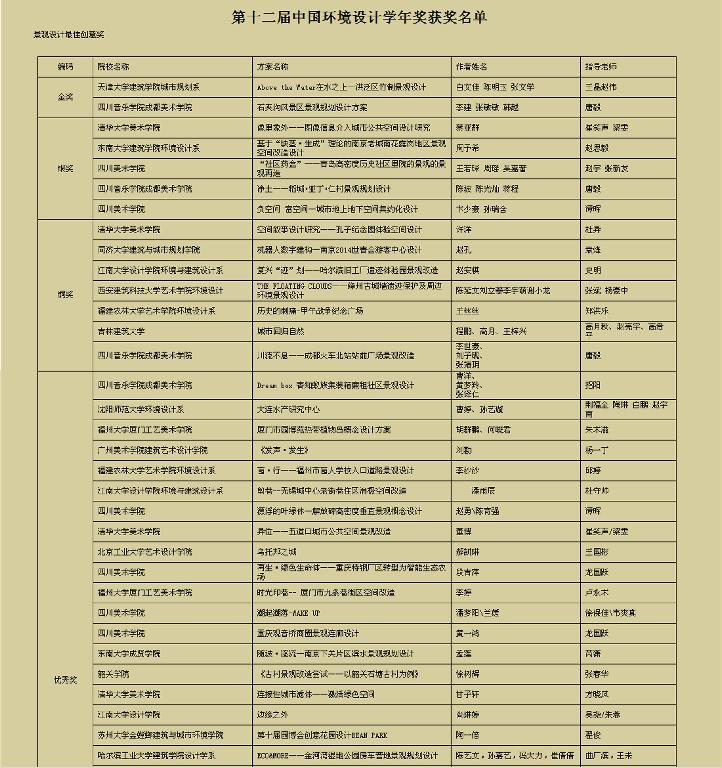 第十二届中国环境设计学年奖获奖名单