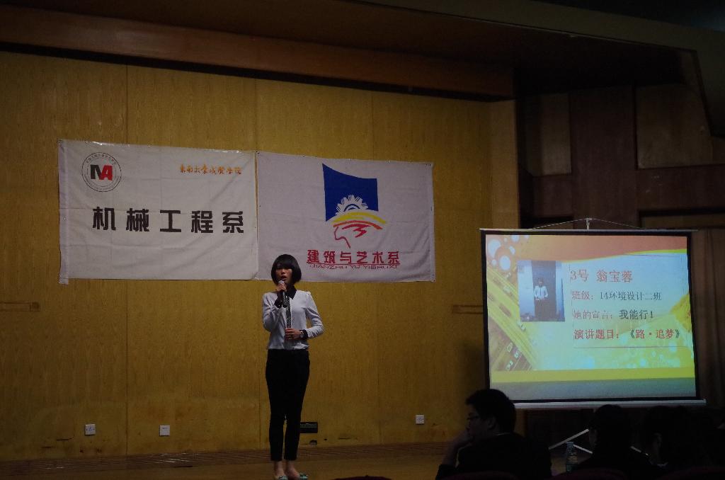 此次演讲比赛经过初选,共有8名同学进入了决赛。决赛中,各个选手精心准备,有的幽默诙谐,有的成熟稳重,有的激情昂扬,每个人都通过这次比赛展现了自己高超的口语表达能力和特色的人格魅力。经过第一轮自我展示和第二轮主题演讲的激烈比拼,来自14环艺2班的翁宝蓉同学凭借个人朴实而又动人的演讲《路•追梦》博得了评委老师和观众的心,获得了一等奖,其他分获二、三等奖。