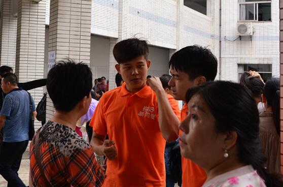 穿着橙色志愿者服的学姐学长们耐心向新生介绍学校以及学院的规章制度。新生报到工作有条不紊地进行着。