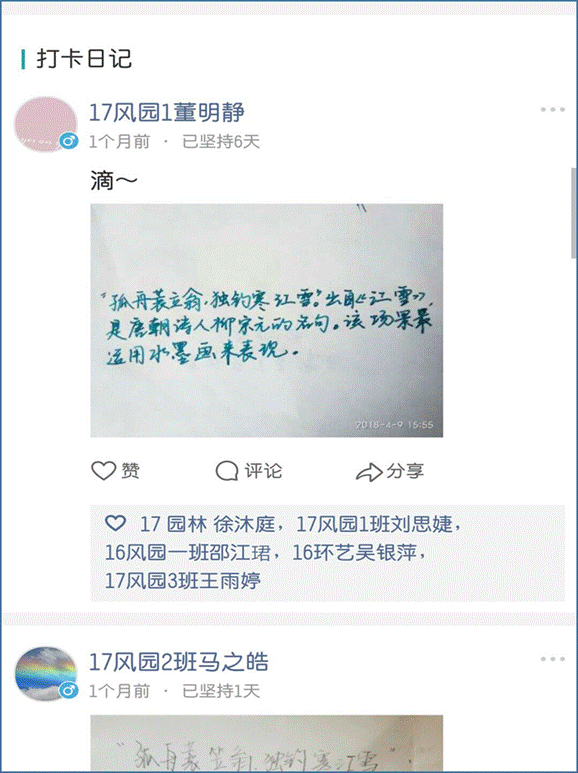本次比赛创新采用手机自媒体,利用微信平台操作简便受众广泛,统计科学的优势,使用“小打卡”这一小程序,每天向参与打卡同学推送三个专业相关知识点或诗文美句、歌词赏析、传统文化剖析等内容,以抄写、拍照上传、语音反馈形式提高学生的参与积极性,在整个小打卡推送过程中,我院组建了一支以学生线老师为主、学生干部为辅的小打卡管理团队,保证小打卡工作的正常开展,自3月底到5月底为期两个月(休息日无推送),在这期间,共给打卡人数213人,打卡总记录数为987次,其中打卡时间最长学生坚持打卡57天,对学生养成良好的学习习惯有推动作用。本次小打卡活动共计颁发博文奖、智明奖、敏达奖、睿思奖、持之以恒奖共计16人次,均颁发证书及奖金。
