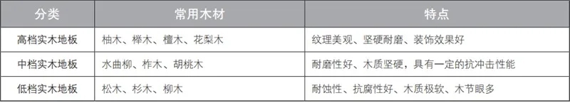 常用于制作实木地板的木材有:松木、水曲柳、柞木、柚木等。根据木材特点不同分为高、中、低三档。具体见表1-5。