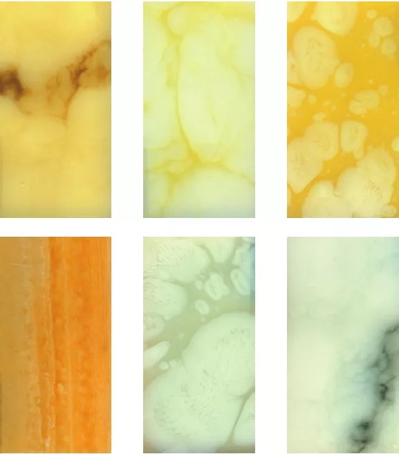 图2-2-1 新米黄(左)、雪花白(中)、橙皮红(右)
