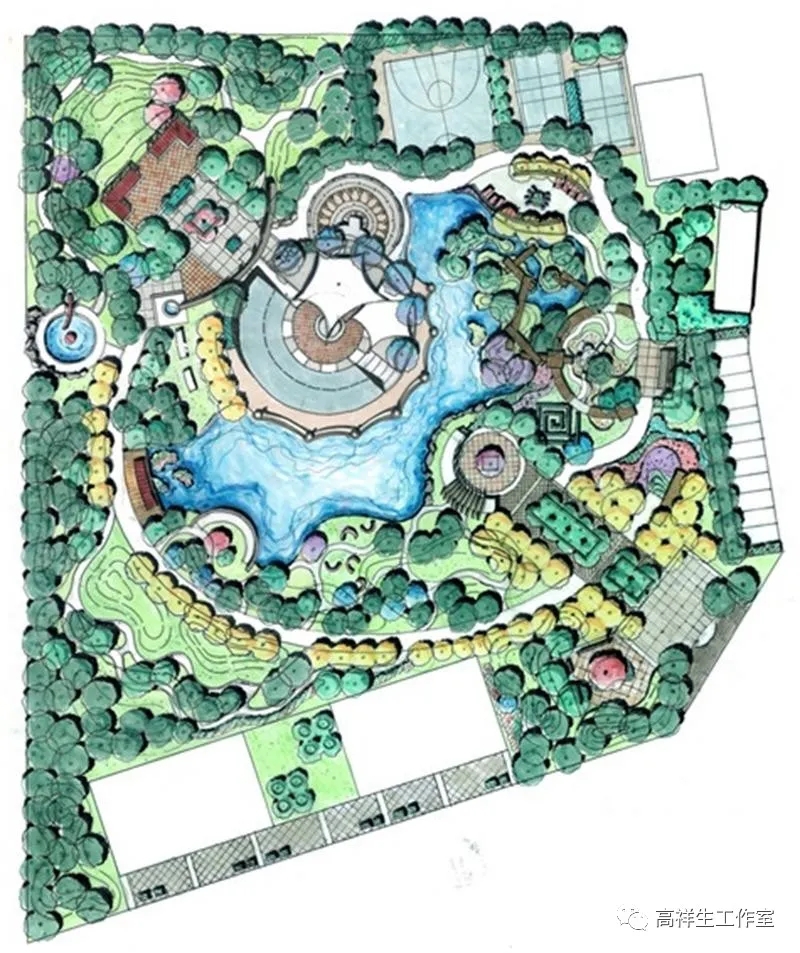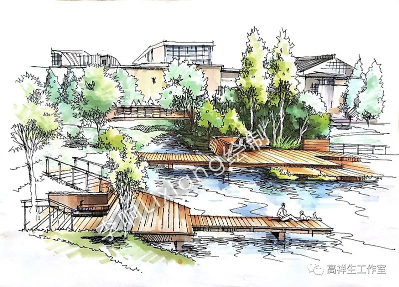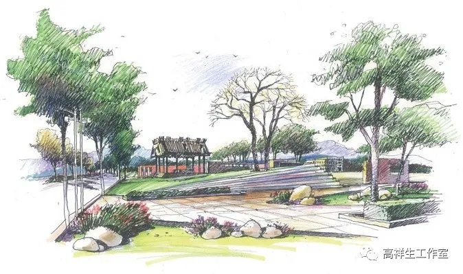 史莹芳很重视设计手绘,认为手绘是设计师的工作语言,她在重视空间形式表达的同时,也注重客观地反映设计意图,强调应能表达使用功能和空间关系。史莹芳老师的线构,注意了艺术、技术与功能形式的结合。这些图有浓墨重彩的渲染,也有浅淡随意的涂抹,反映了她对“线”与“色”的表现,对景观形态构成娴熟的把控能力。