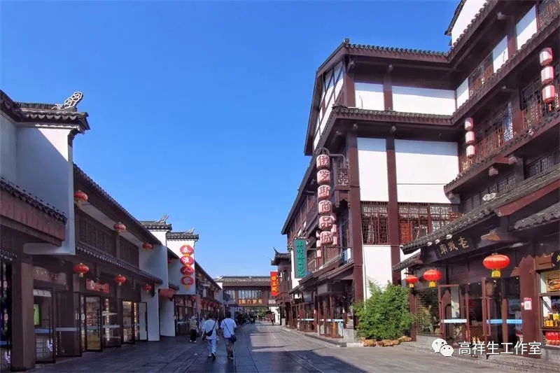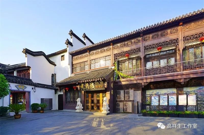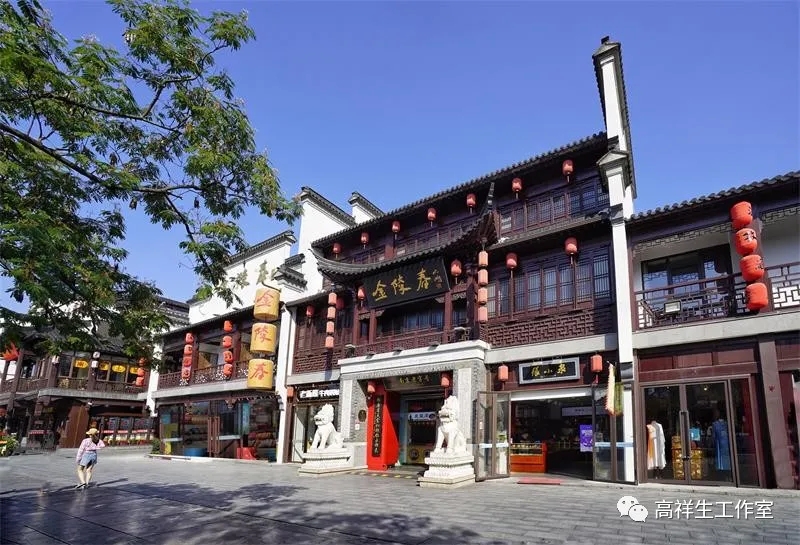 原贡院街的商铺在减少,而在大石坝街的商铺,特别是餐饮建筑增加了。在这里有晚晴楼、天圆楼、老盛庆、金陵春、秦淮人家、咸亨酒店等大石坝街的商铺更加注重了商铺的细部装饰,大多采用回字纹、万字纹。店招一律由名家书写,店招的形式多数竖向布置……都是新中式风格。很显然大石坝街商铺的风格也延续了东市、西市的商铺风格。