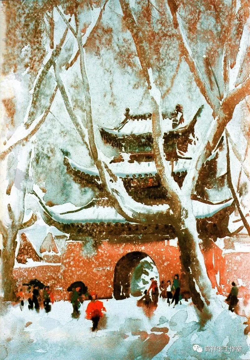 最让我念念不忘的是贡院街的北侧有一座贡院的明远楼,绘画大师崔豫章教授用水彩画表现过它,画面上明远楼和两旁的梧桐树都弥漫在纷纷扬扬的大雪中,雪花飘落在画面上,浸开的水迹,使水彩画的水韵更浓。如今大师人去,旧时的明远楼已不在,留下的是大师的才情和满满的夫子庙景区旧时的记忆。