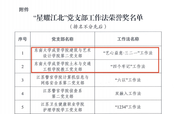 为深化党建强基系列行动,真正把党建基因融入江北新区发展血脉,进一步发挥基层党组织战斗堡垒作用和党员先锋模范作用,世界杯官网推选的世界杯体育官方网站第二党支部“艺心益意·三二一”工作法和土木与交通工程学院教工党支部“四个牢记”工作法在江北新区此次“星耀江北”党支部工作法评选活动中双双获奖。
