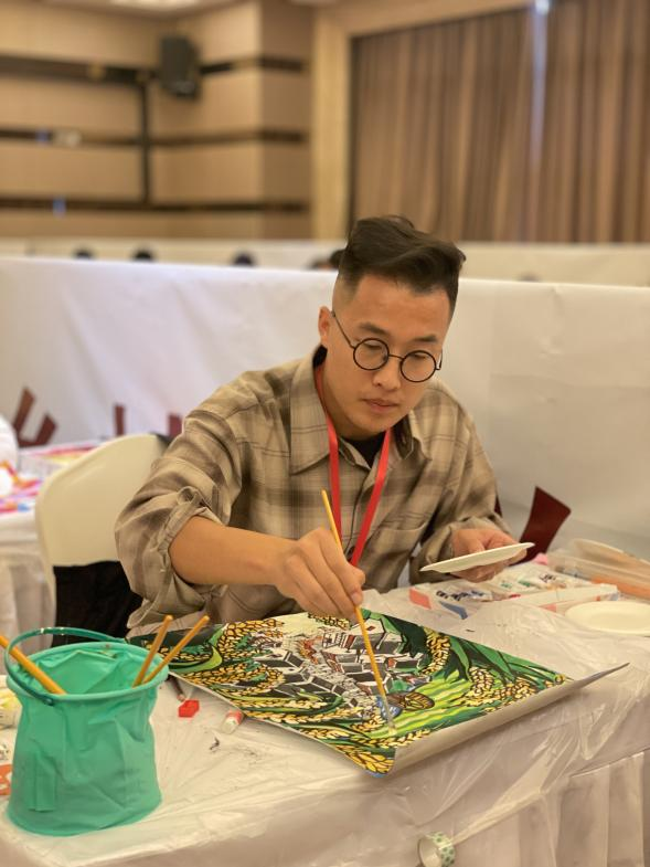 在以“美丽乡村”为主题的农民画决赛中,李响老师现场创作了农民画《禾下乘凉梦——新农村风貌》,其灵感来自“杂交水稻之父”袁隆平对杂交水稻高产的不懈追求:画面中高大饱满的水稻为秀美的村落洒下一片清凉,村民们幸福地舞起了长龙,寓意以袁隆平教授为代表的仁人志士为农村的振兴和发展作出了伟大的贡献,预示着农村的生活将会越来越好,越来越惬意。