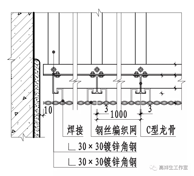 图 13-3-28 暗龙骨金属网顶棚构造节点图(二)