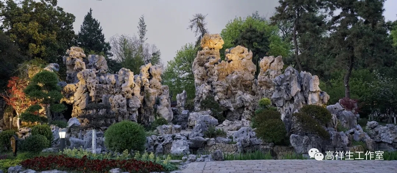 华灯初上,我们离开多姿多彩的莫愁湖公园,回头瞻仰公园入口处成片的湖石,高低错落,天然成趣,在绿荫的簇拥下尽显雄浑而包容的气息。