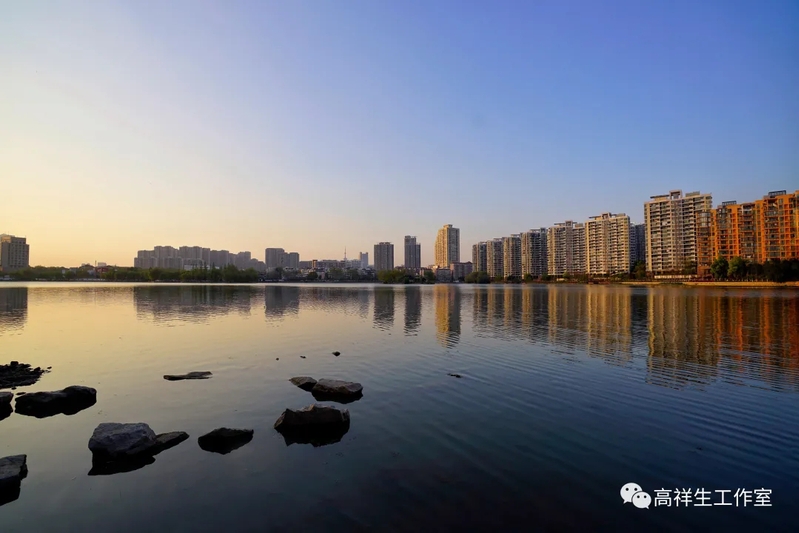 夕阳下湖岸楼宇接踵 湖中碣石佇立 高祥生摄影
