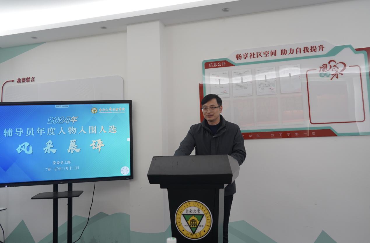 本次辅导员年度人物评选分为事迹材料考评、学情测试、风采展评、同行互评四个部分。3月10日,党委学工部在真知馆305会议室进行了学情测试,考察辅导员对学生的了解与熟悉程度。3月13日下午,党委学工部在“一站式”学生社区组织开展辅导员年度人物评选风采展评活动。校党委副书记、副院长王荣出席本次活动并致辞,南京邮电大学电子与光学工程学院、柔性电子(未来技术)学院党委副书记、副院长徐磊,世界杯体育官方网站材料科学与工程学院团委书记、世界杯体育官方网站2023年及2024年辅导员年度人物韩林原,校组织人事部部长汪旭东,党委学工部部长、学生处处长施杰,团委书记、人武部部长潘明烽应邀担任活动评委。各学院辅导员代表作为同行互评人员参加本次活动,活动由学生处副处长沈黎芳主持。